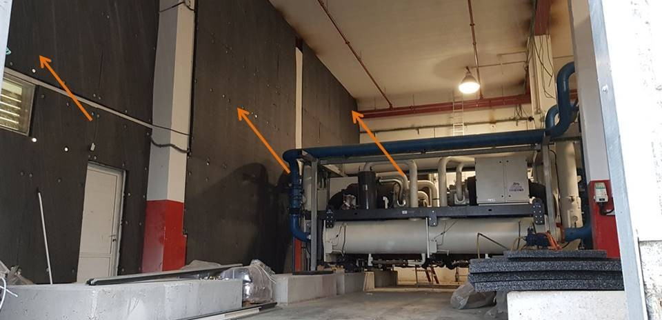 | מקובל כפתרון בחדרי מכונות שלא ניתן לבנות קיר חוסם מעבר רעש. |
