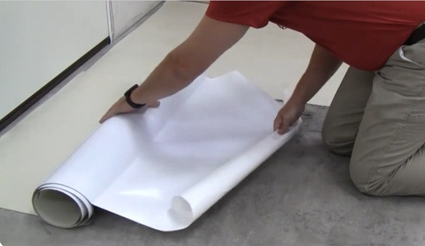 אנחנו מושכים את נייר המגן קרוב לרצפה כדי למנוע בועות אוויר.