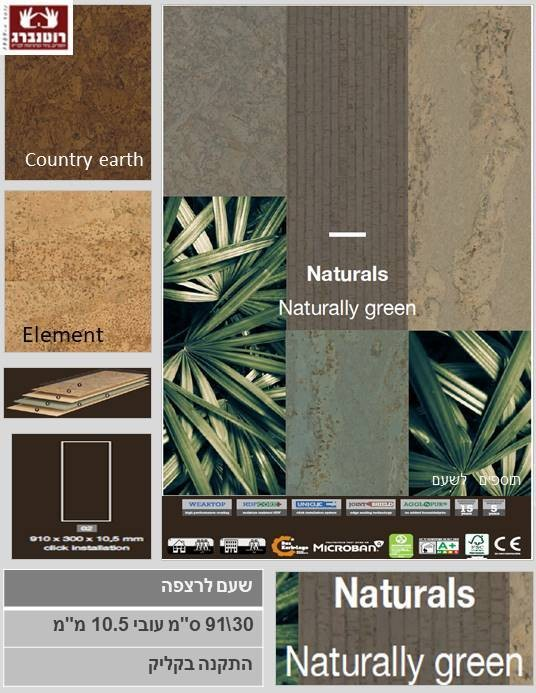 | מגוון טבעי של רצפות פקקי הטבעות במבחר מדהים של עיצובים, טקסטורות וצבעים, קולקציית NATURALS מספקת את הפתרון המושלם ליצירת סגנונות קישוט פנים מפוארים, מודרניים ומסורתיים. רמת שימוש CLASS 23 | אחריות 15 שנות מגורים | 5Y הגנת מוצר אנטי מיקרוביאלית מסחרית MICROBAN ® |